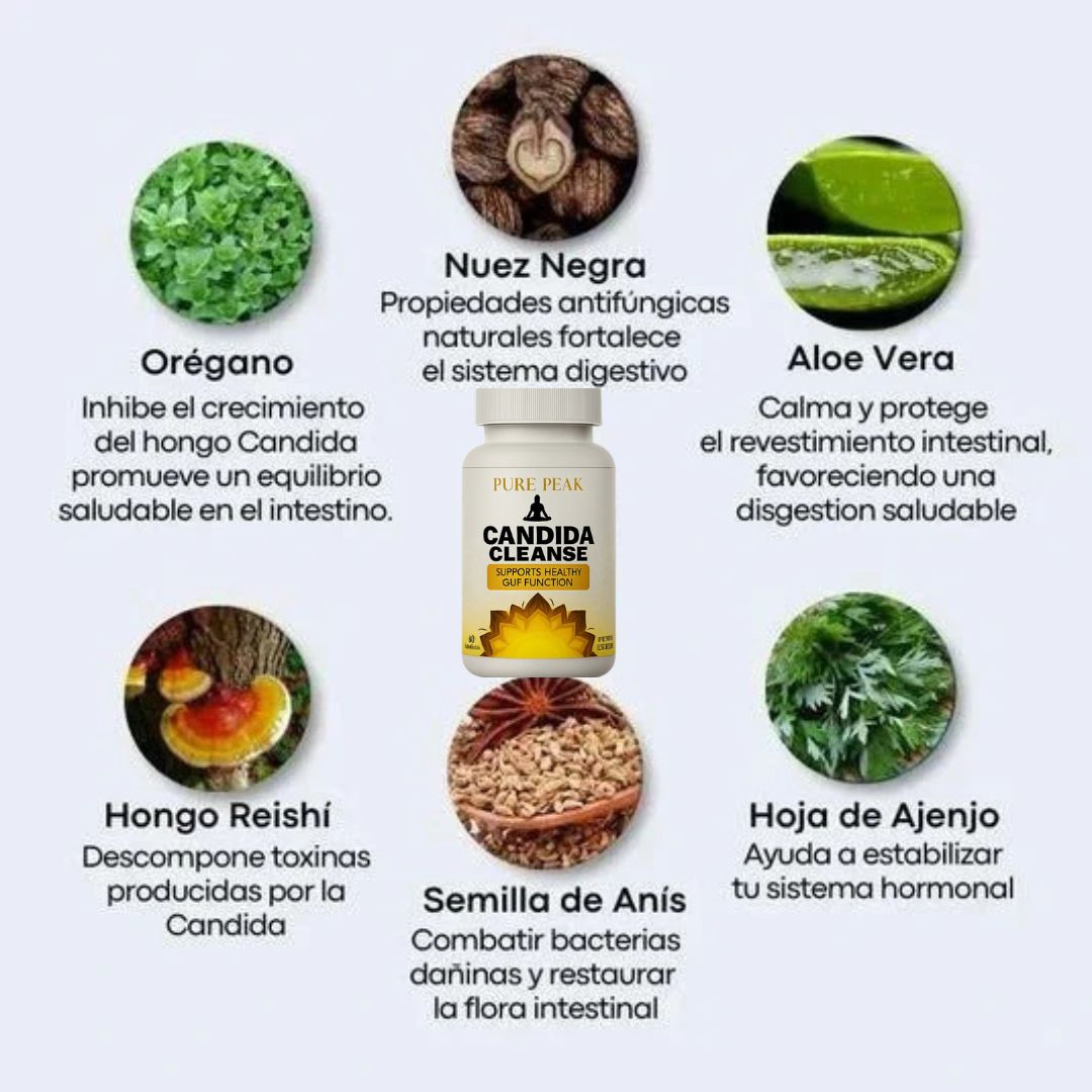 Candida Cleanse® Premium Detox combina extractos herbales y probióticos de alta potencia que trabajan en sinergia para eliminar el exceso de levaduras y restaurar tu flora intestinal e íntima.