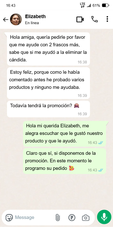 Dos años luchando con cándida y nada me funcionaba. En 6 semanas con este aceite, exámenes negativos. Mi ginecóloga quedó sorprendida. Vale cada centavo. -